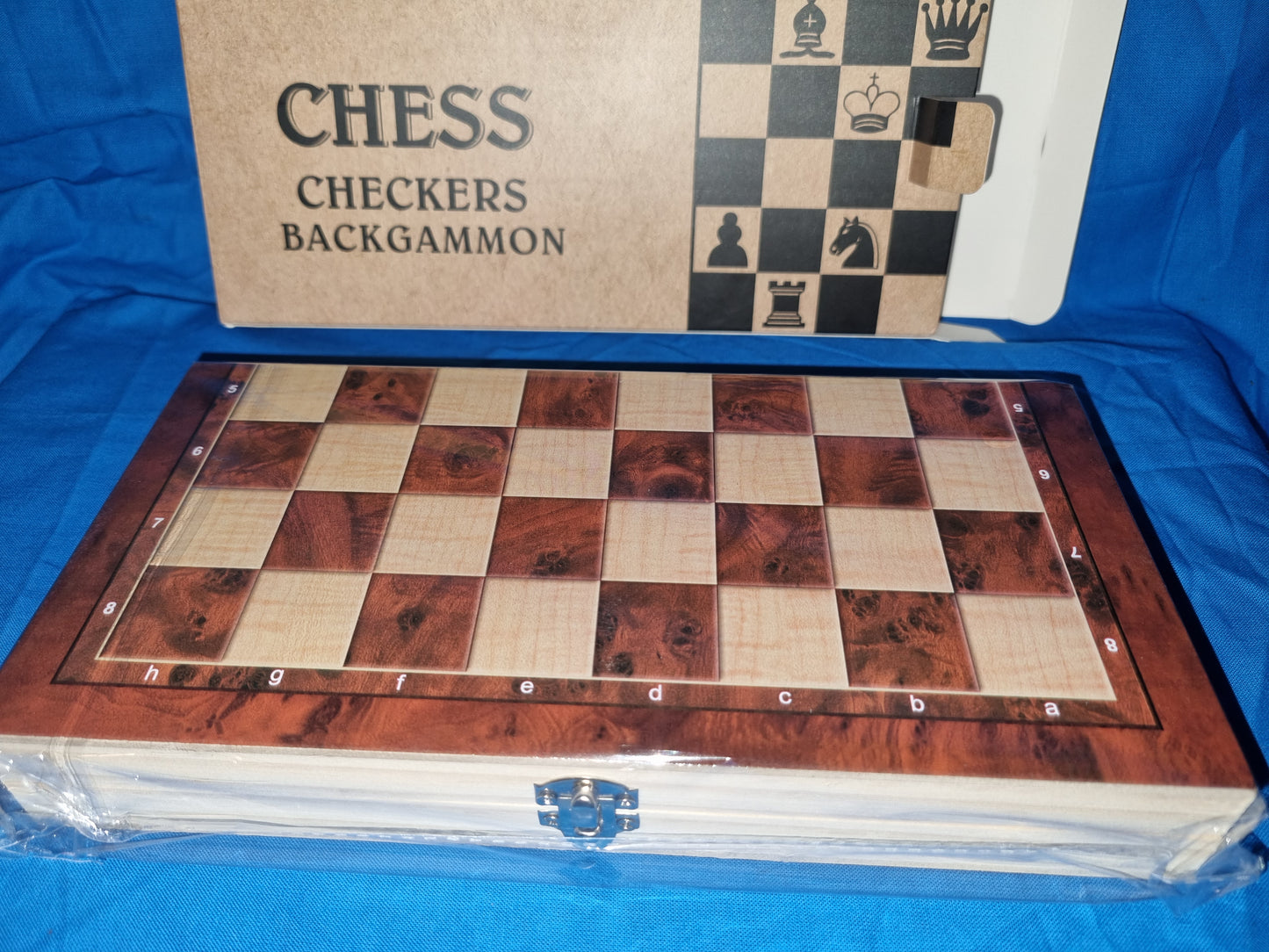 This 3 in 1 set includes Chess, Checkers and Backgammon, perfect for a variety of games in one. The board is made of sturdy wood, ensuring hours of play without needing replacement - perfect for families and game nights.