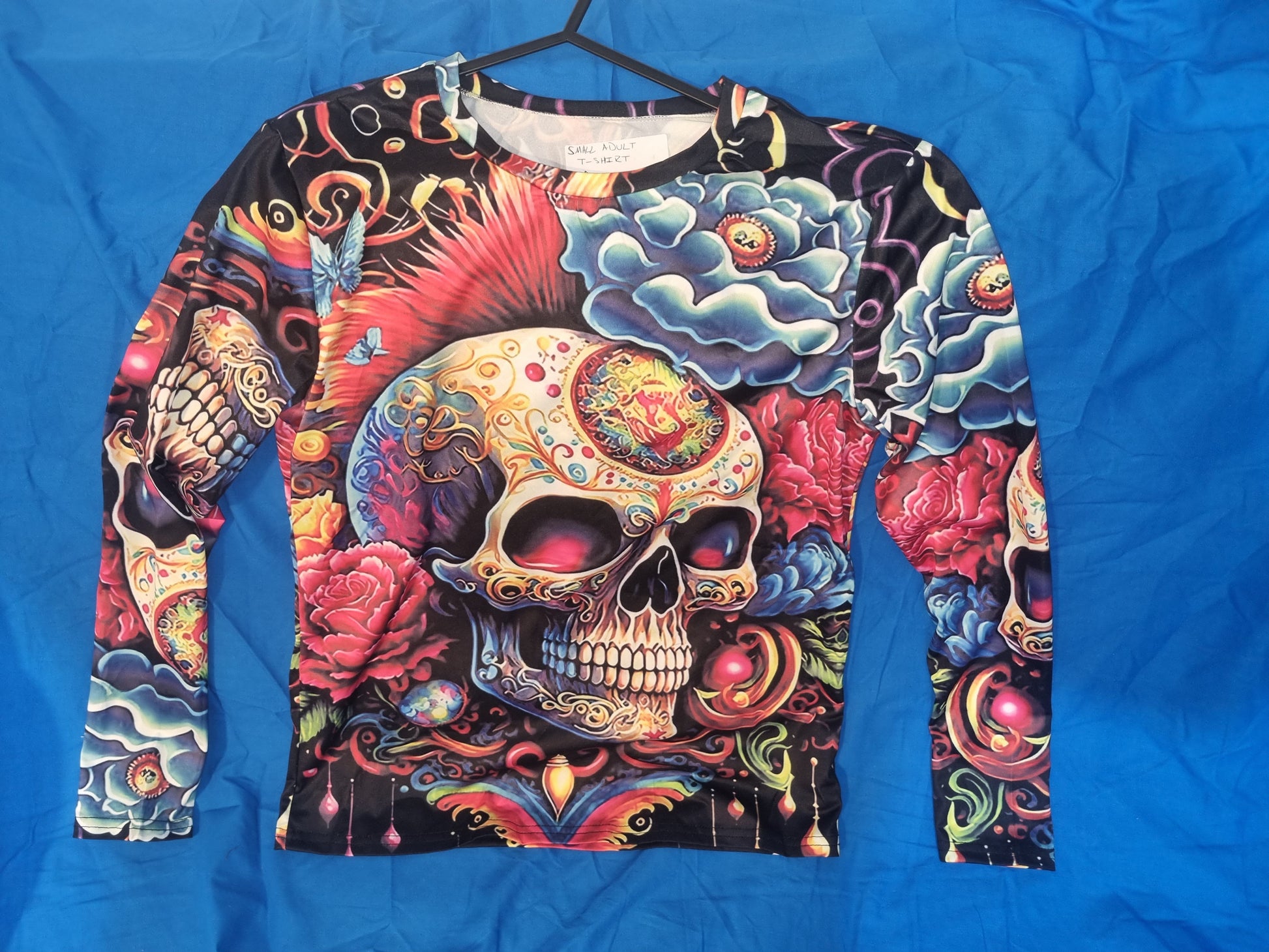 This ADULT SKULL PRINT LONG SLEEVED T-SHIRT is perfect for any casual occasion. The soft cotton fabric and long-sleeved design make it comfortable to wear for long periods of time. The unique skull print adds a stylish edge to your outfit.