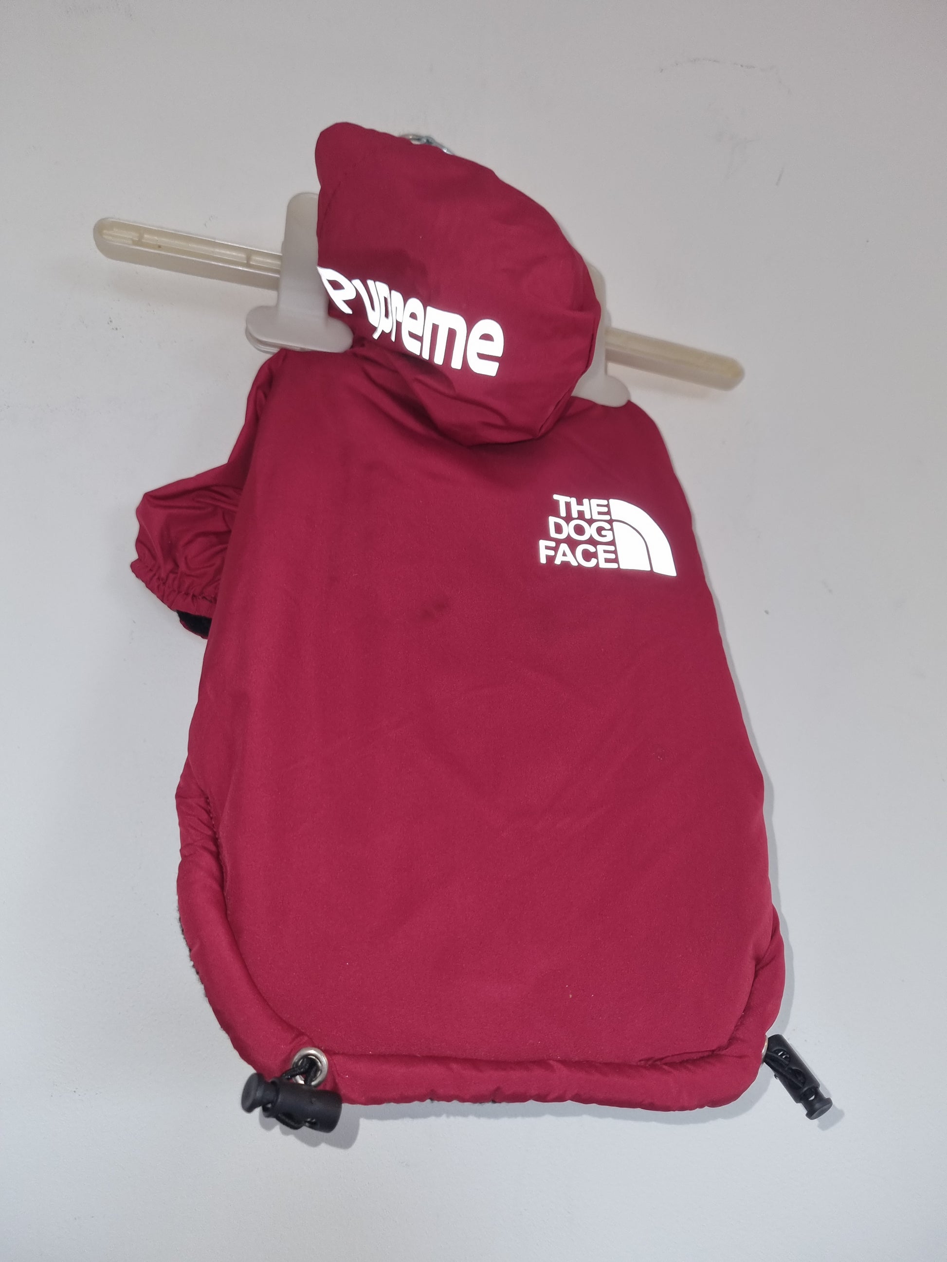 This chihuahua sized red coat is printed with supreme and the dog's face. Made for small dogs, it adds a stylish touch while keeping your furry friend warm. Made with high quality materials, it's both fashionable and functional. Perfect for any dog lover or fashionista looking to keep their pup cozy. This is size 2
