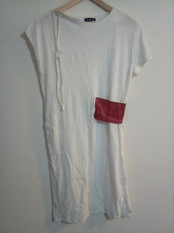 This medium cream stylish dress with red band is perfect for any occasion. Made with high-quality fabric and a flattering fit, this dress is both stylish and comfortable. The red band adds a pop of color and the medium size allows for a versatile fit. Upgrade your wardrobe with this elegant dress.