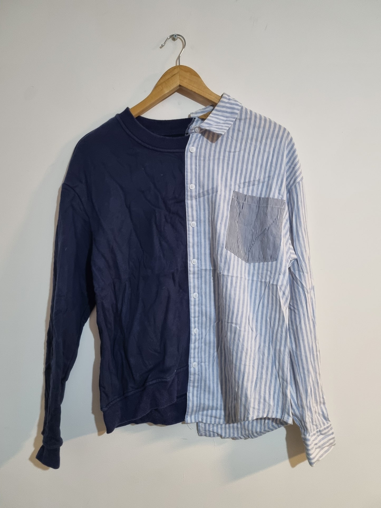 This men's shirt/sweater combo features a unique half and half design, combining a classic blue color with eye-catching stripes. Perfect for both casual and professional occasions, this versatile piece is sure to make a statement.