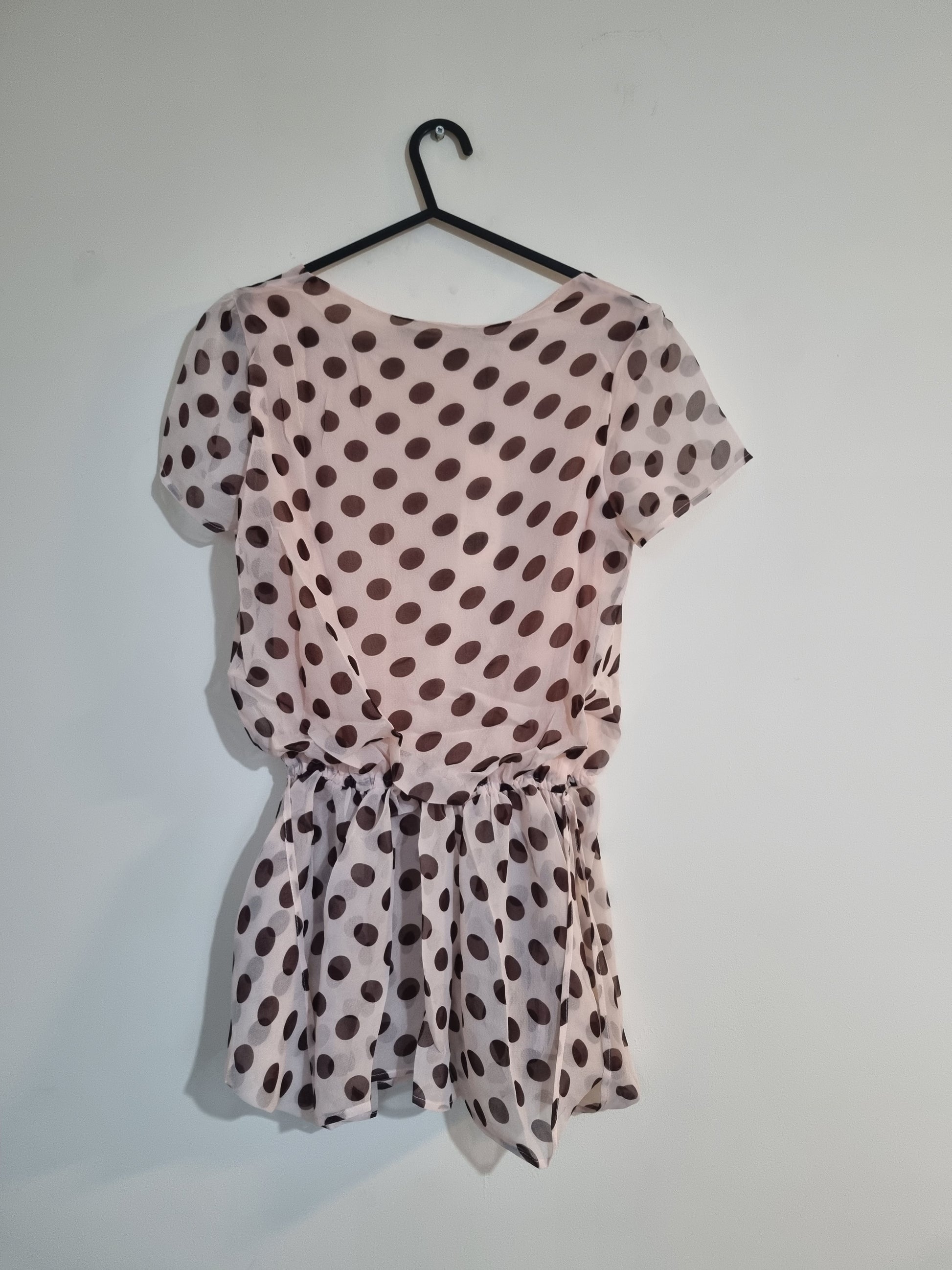 This chic dress features a playful polkadot pattern in classic brown and white. With a flirty peach underlay, this dress adds a pop of color to your wardrobe. The perfect mix of sophistication and fun, this dress is sure to make a statement at any event.