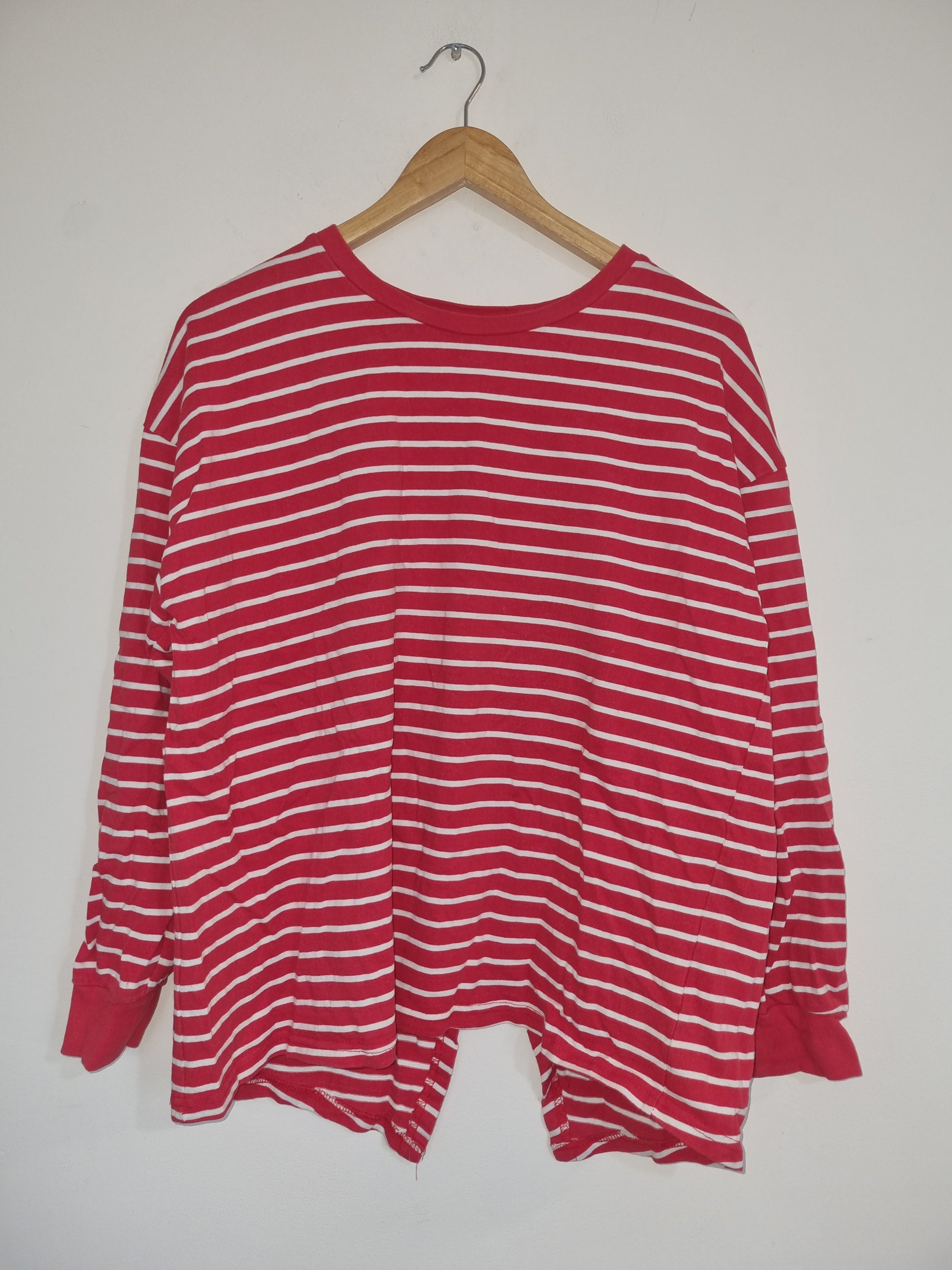 "This women's top features a striking red and white striped design, adding a bold touch to any outfit. Made for comfort and style, this top is perfect for any occasion."