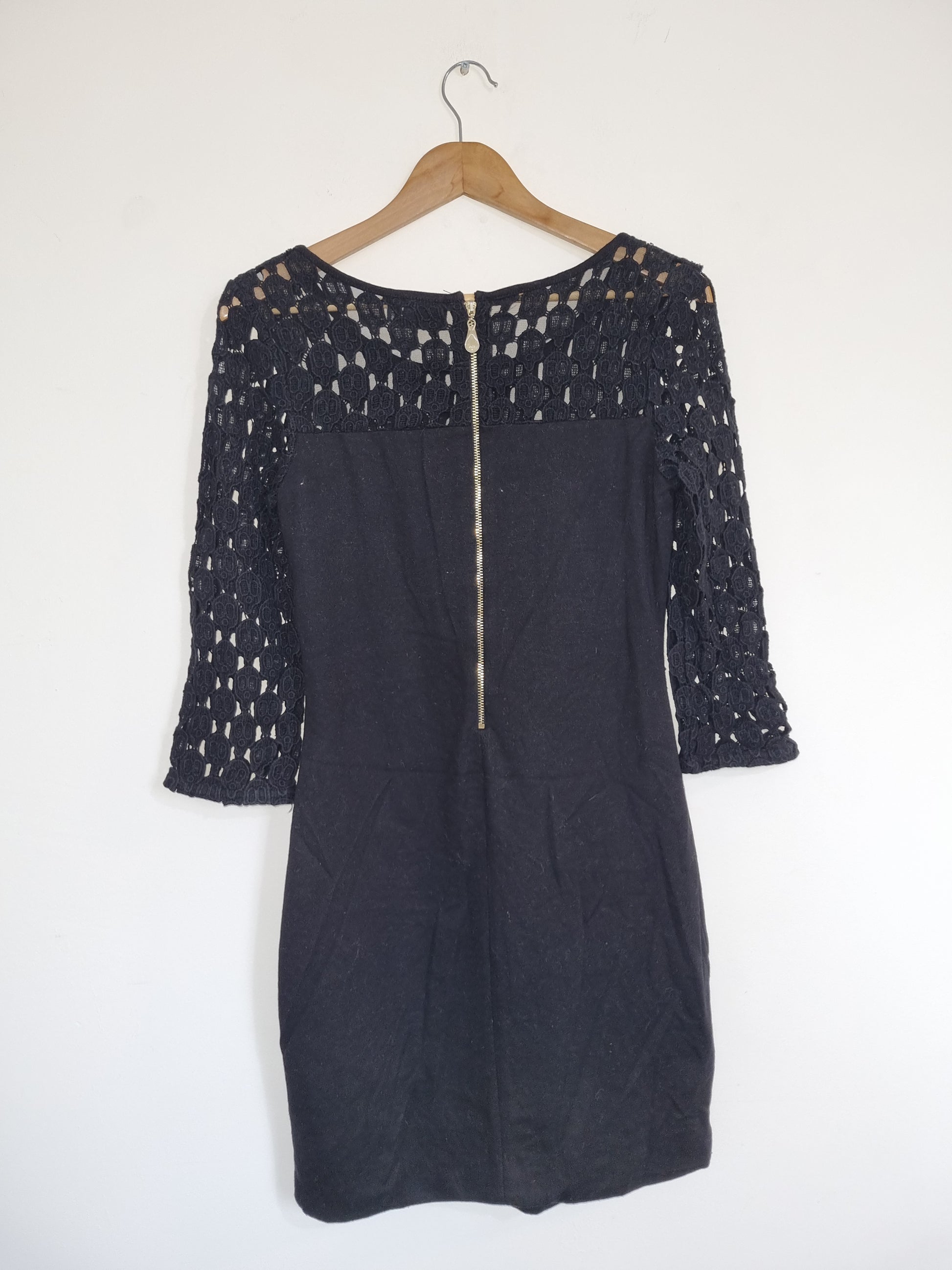 This black dress features a unique netted design on the neck and arms, adding a touch of elegance to the dress. Made for women's sizes small and medium, this dress is perfect for any occasion.